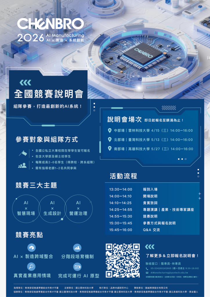 【活動資訊】國立雲林科技大學辦理「AI Manufacturing 2026全國競賽」說明會,歡迎踴躍報名參加。