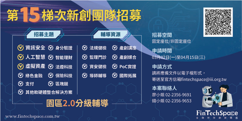 第15梯次團隊招募,即日起至4/15(三),誠摯邀請金融科技相關業者加入園區,一起打造金融創新應用🚀