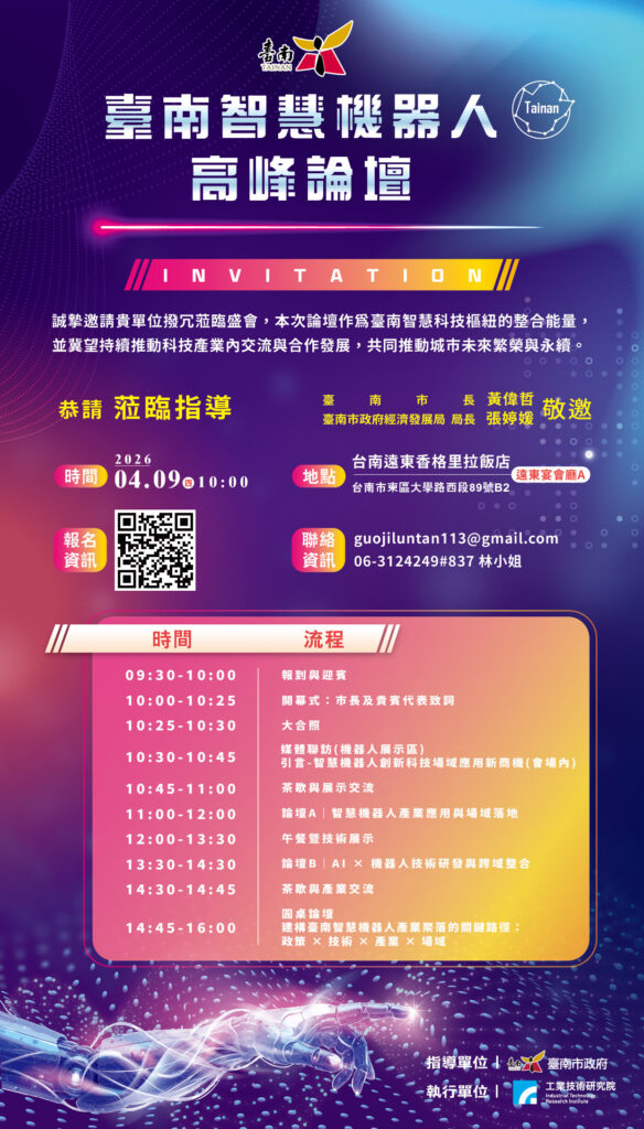 當 AI 技術快速發展並與機器人深度融合,產業轉型與升級正迎來關鍵契機。為促進智慧機器人技術交流與產業鏈結,誠摯邀請貴單位蒞臨參與「臺南智慧機器人高峰論壇」,共同掌握未來產業發展趨勢。